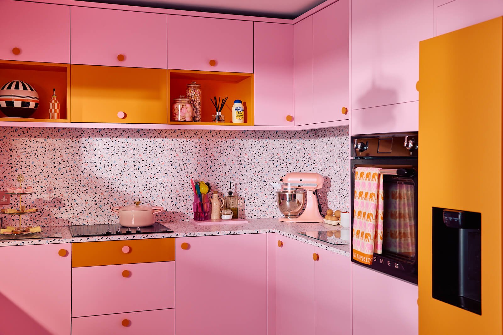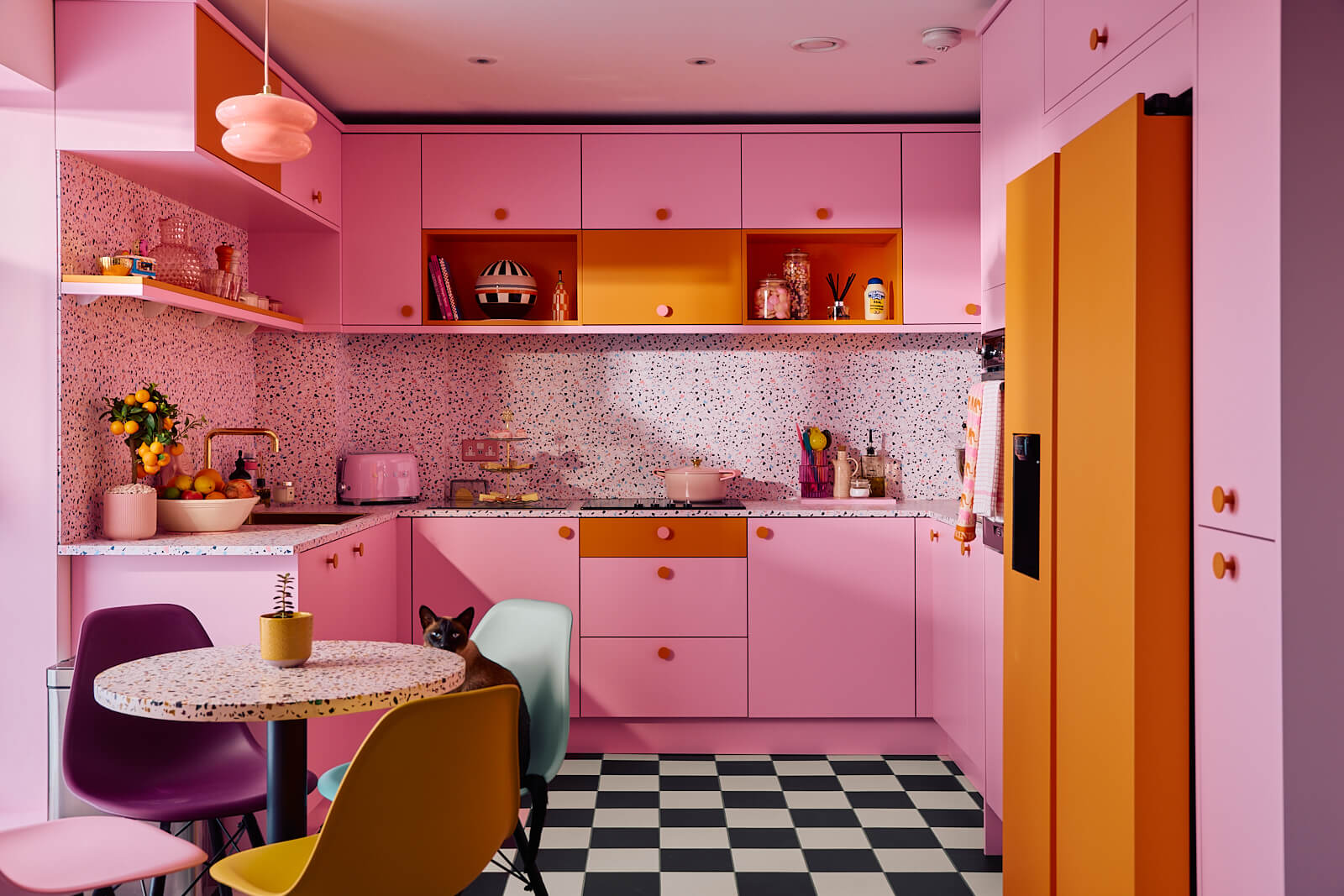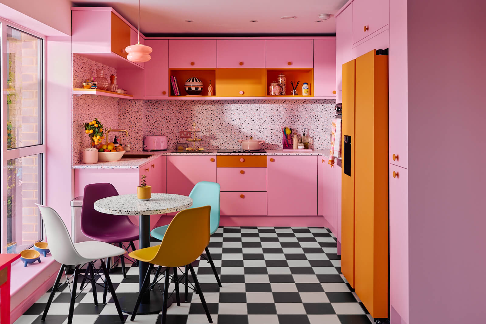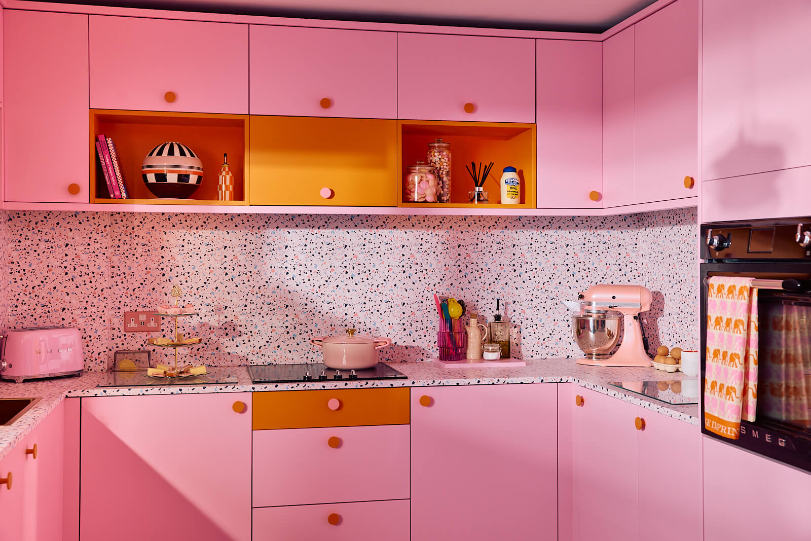 The starting point for this kitchen was a single object: a pink Smeg toaster. Inspired too by the cheerful hues of Dolly Mixture retro sweets, the scheme embraces bold, nostalgic colours with a modern twist. That playful pop of colour inspired the bold palette and became the anchor for the entire design.