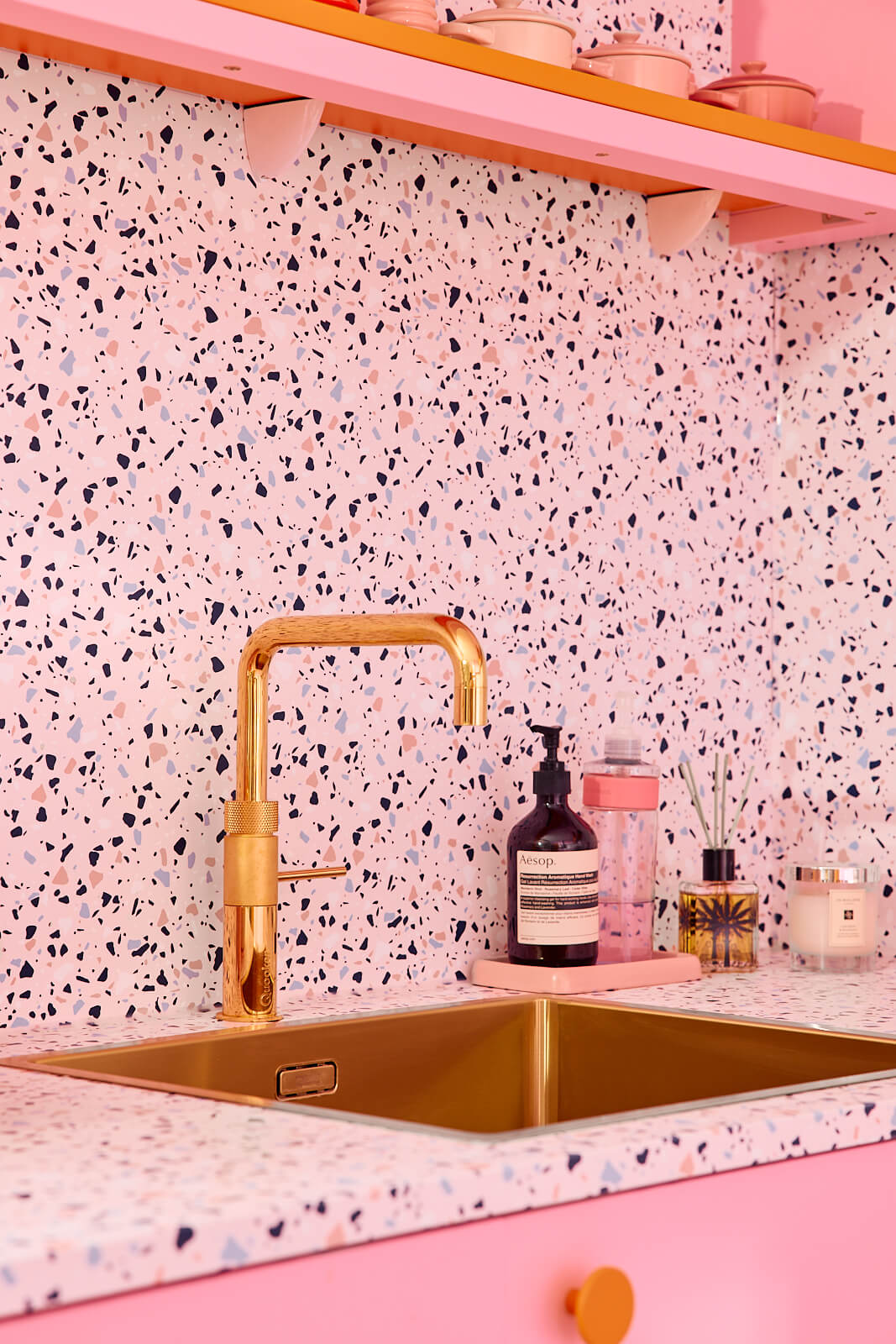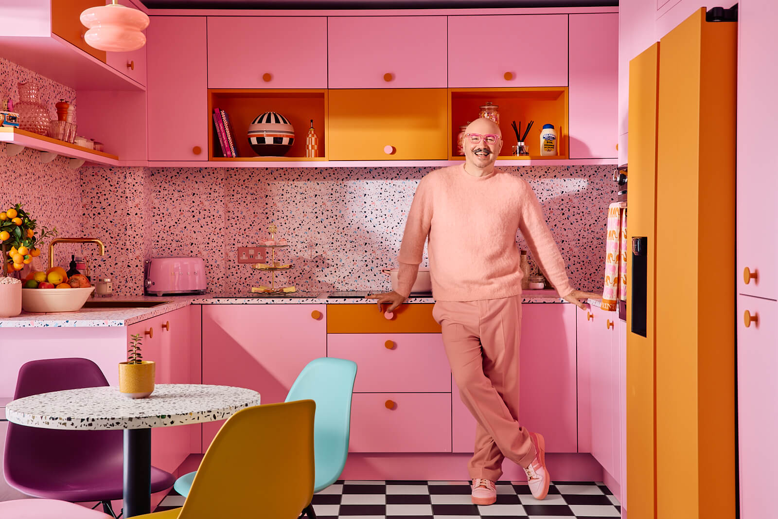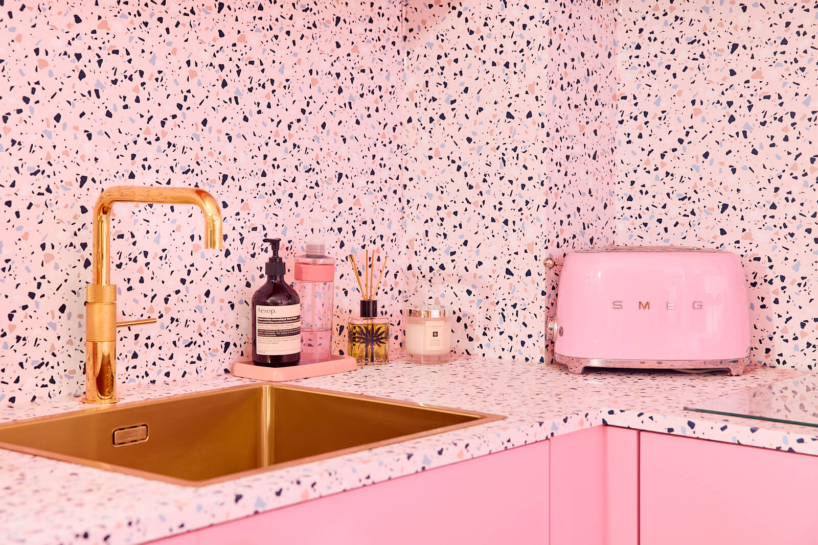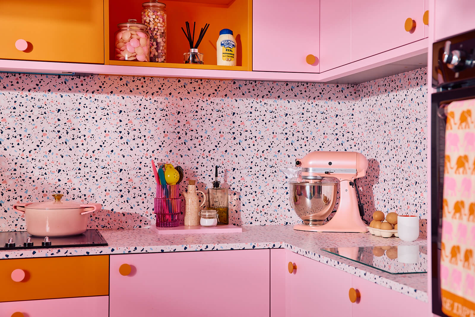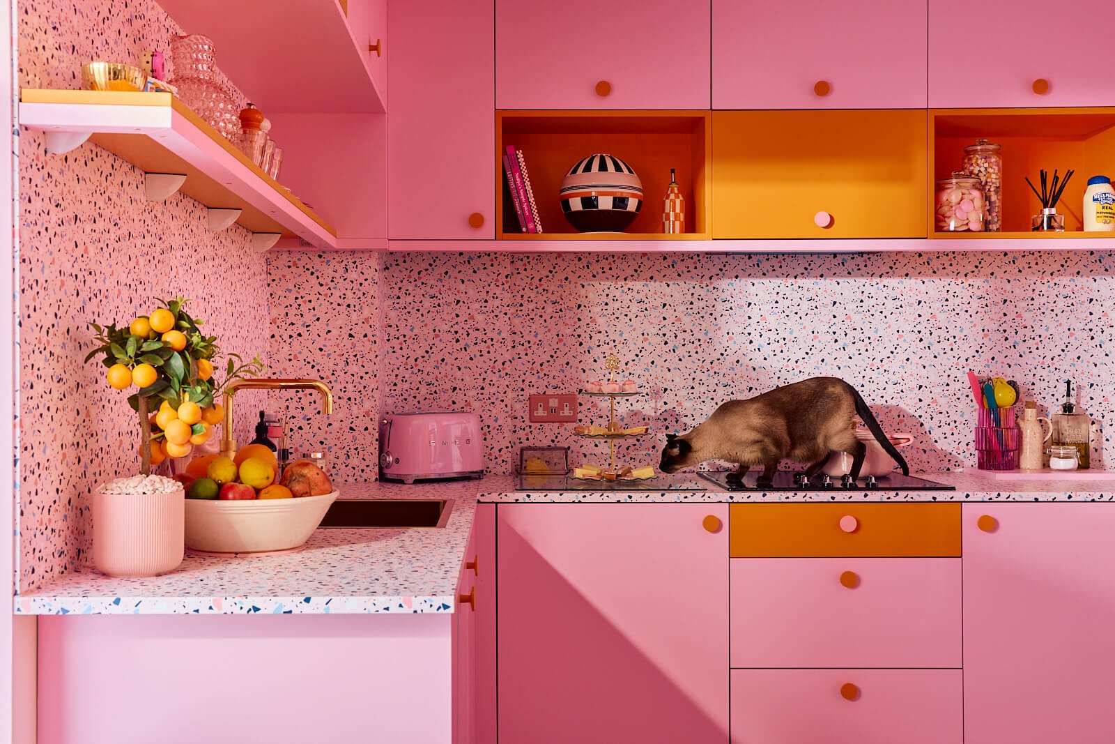 The starting point for this kitchen was a single object: a pink Smeg toaster. Inspired too by the cheerful hues of Dolly Mixture retro sweets, the scheme embraces bold, nostalgic colours with a modern twist. That playful pop of colour inspired the bold palette and became the anchor for the entire design.