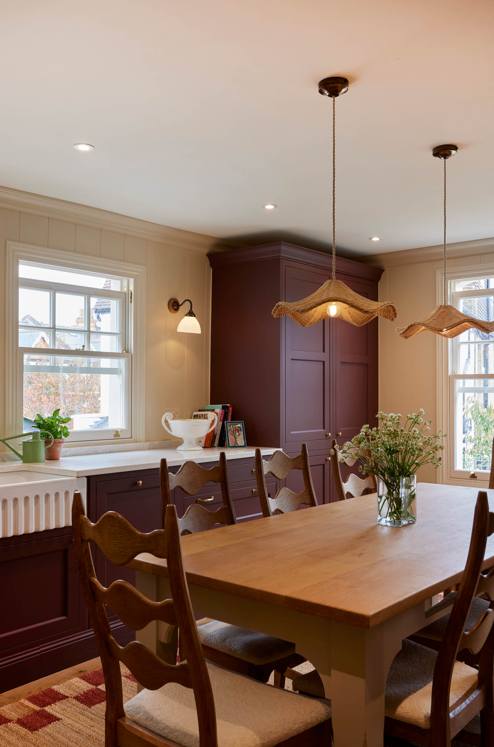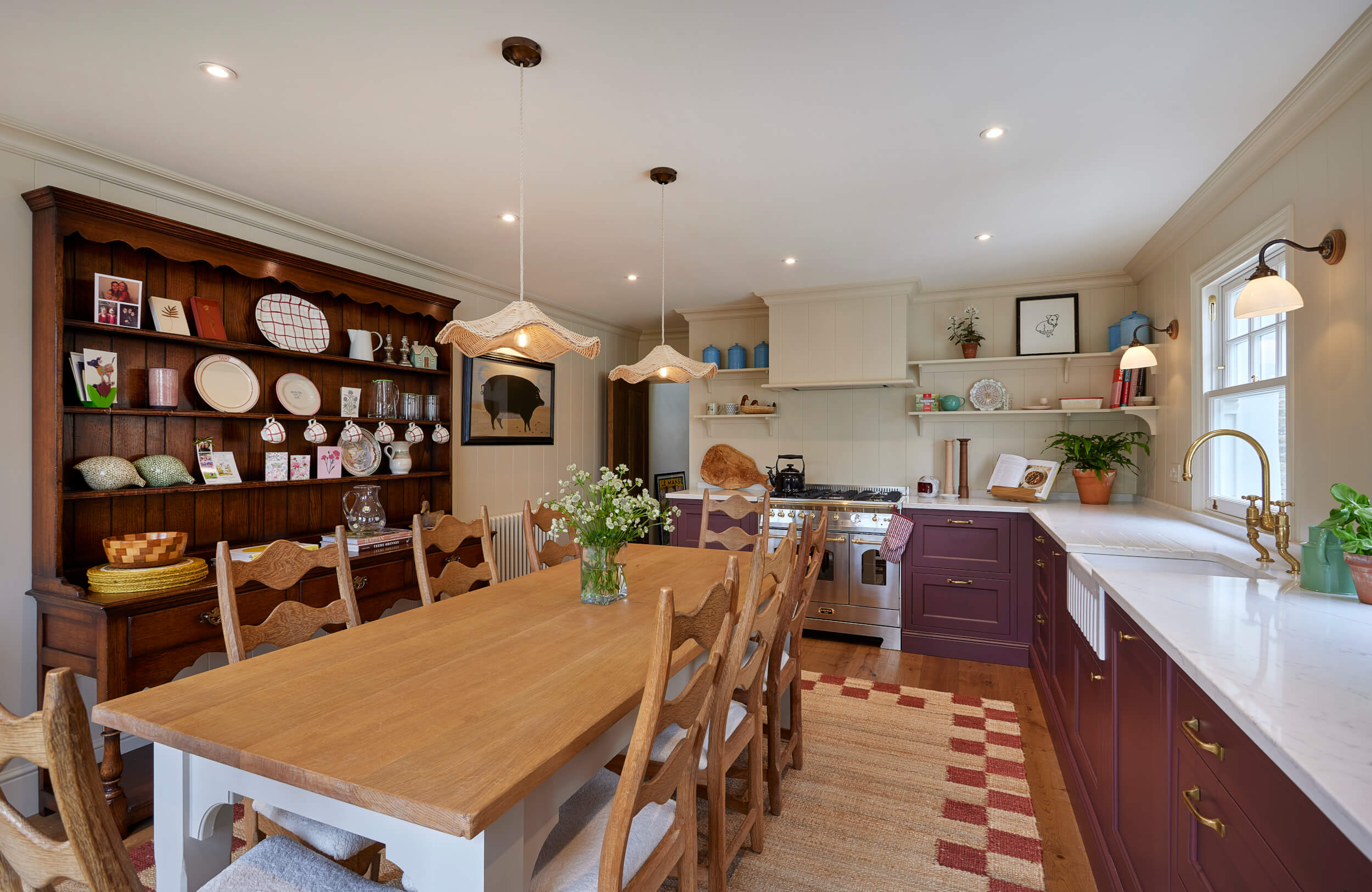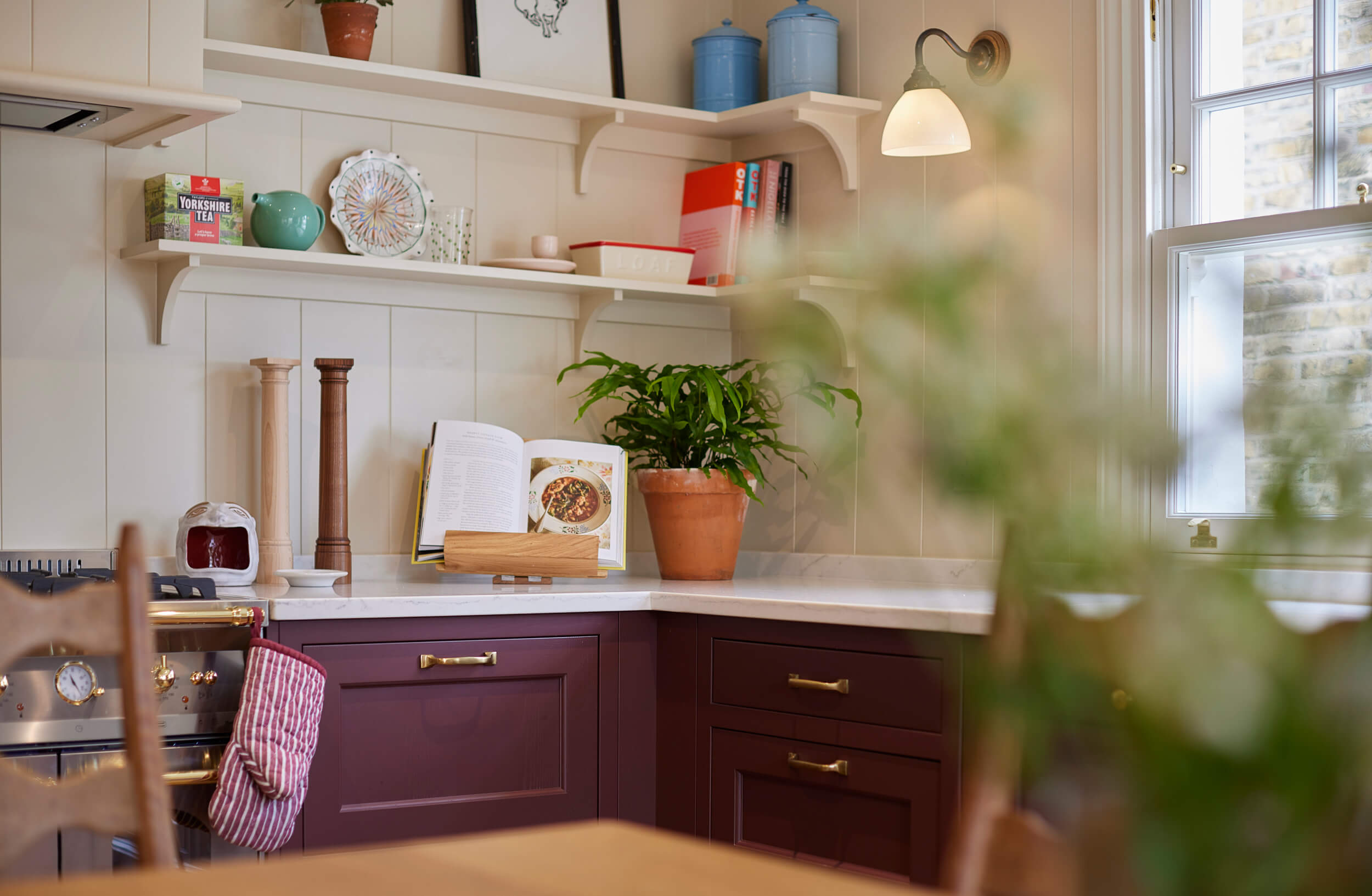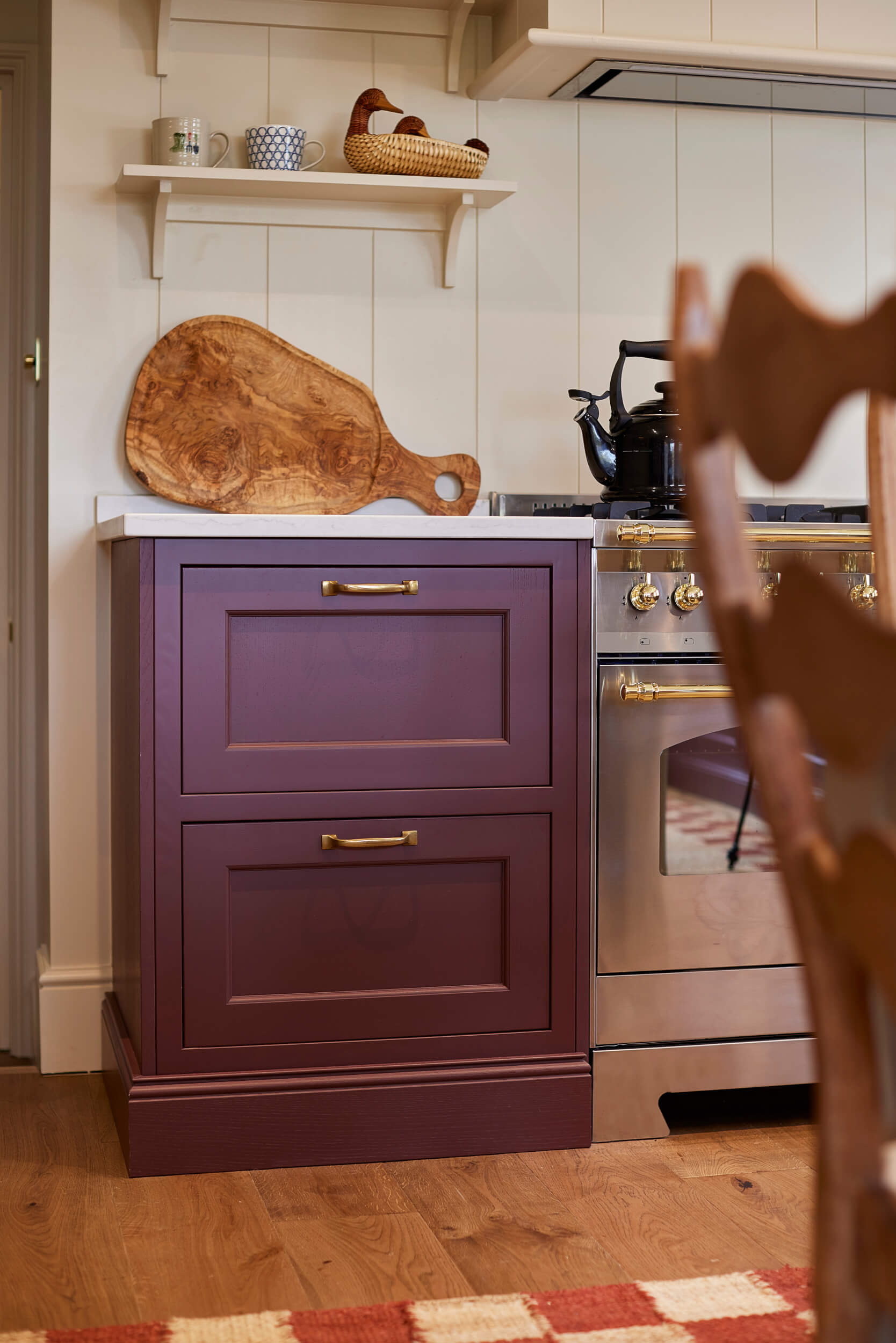 "I loved creating this classic kitchen — we explored deep burgundy shades to complement the brass details, making it perfectly timeless. Keeping the space light and airy on top with open shelving and creamy tones brought a beautiful balance. By using only the L-shape on one side of the room, Tiffany was able to bring in some of her own furniture, adding extra character. It all came together perfectly."