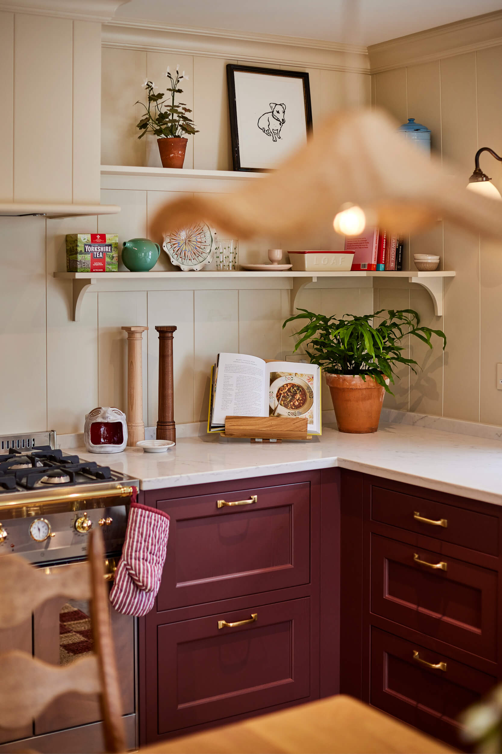 Tiffany wanted her kitchen to feel like an escape from city life — calm, classic, and beautifully inviting. She was drawn to the enduring appeal of our in-frame cabinetry, pairing it with brass hardware, marble-effect worktops, and natural oak accents to create a space that feels both sophisticated and homely. Soft cream walls keep the kitchen bright and airy, while the deep, custom-mixed red colour of the cabinetry adds richness and warmth. Open shelving introduces a relaxed, personal touch, allowing Tiffany to display her collection of ceramics, cookbooks, and greenery — creating a kitchen that feels truly lived in and loved.