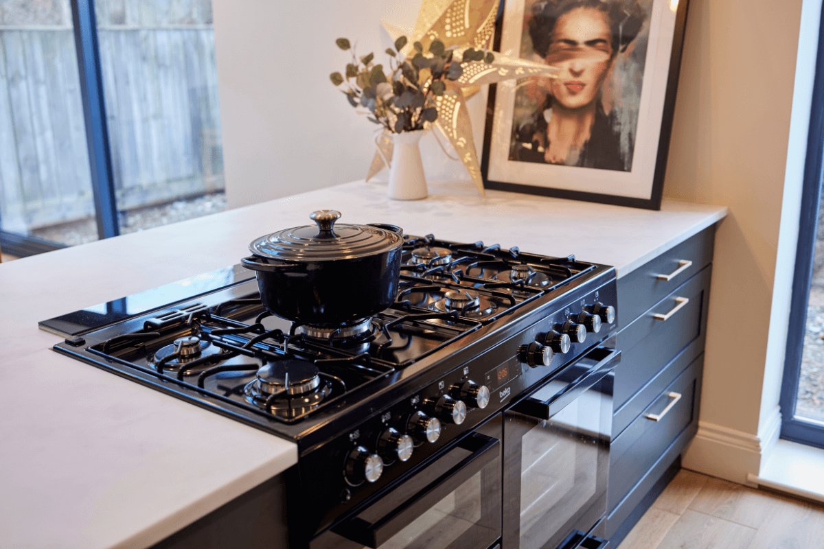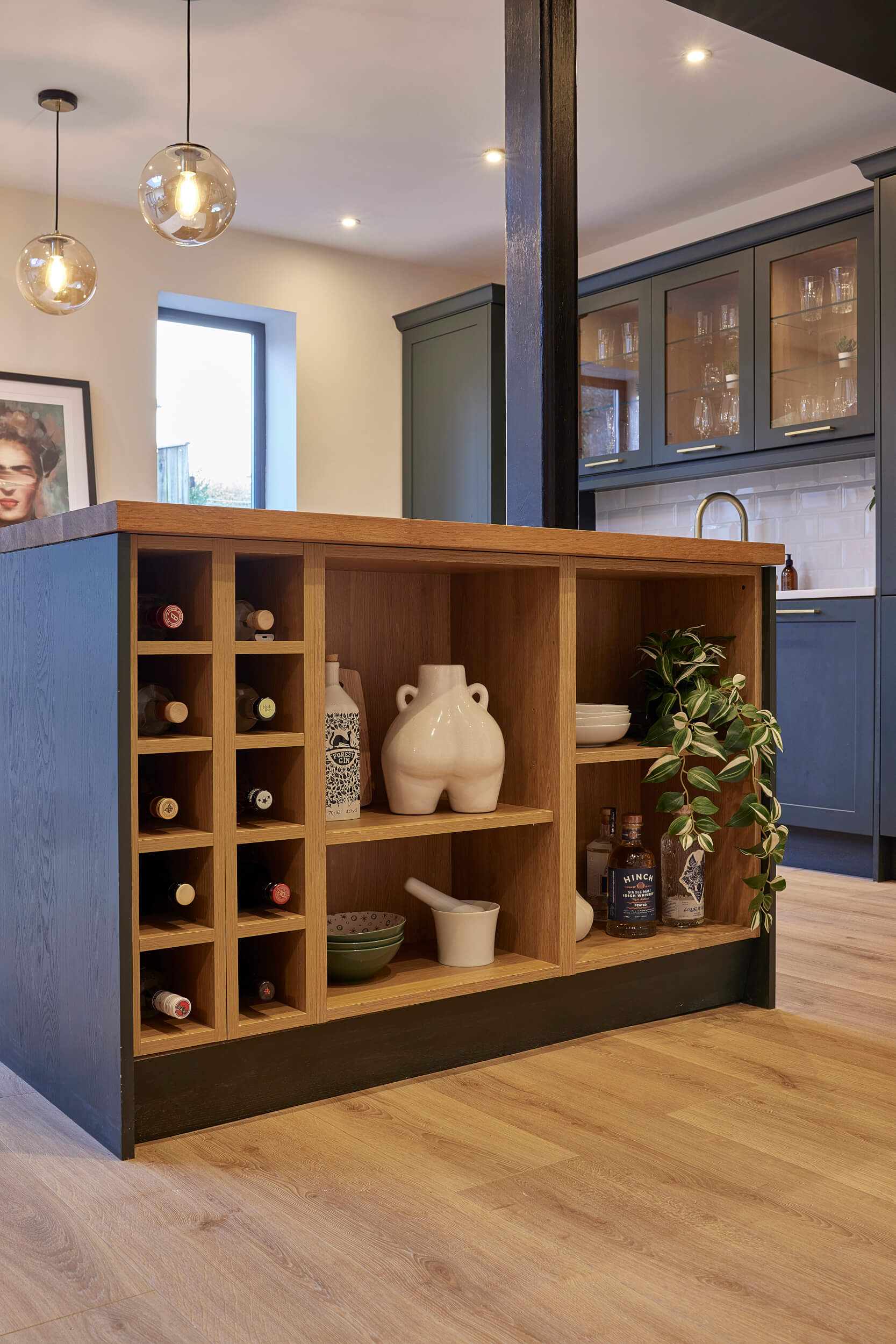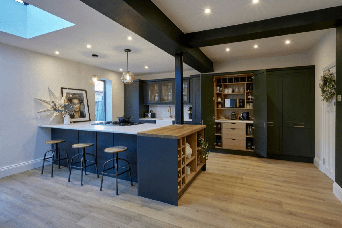 Clever storage was important, as well as a large functional island. The room featured a large support pillar, which we built the island around to create the look of a natural standout feature that didn’t disrupt the flow of the design. The kitchen boasts a blend of wooden features from an oak worktop to wine rack and shelving at the end of the island, consistent with the traditional and warm feel of the space.