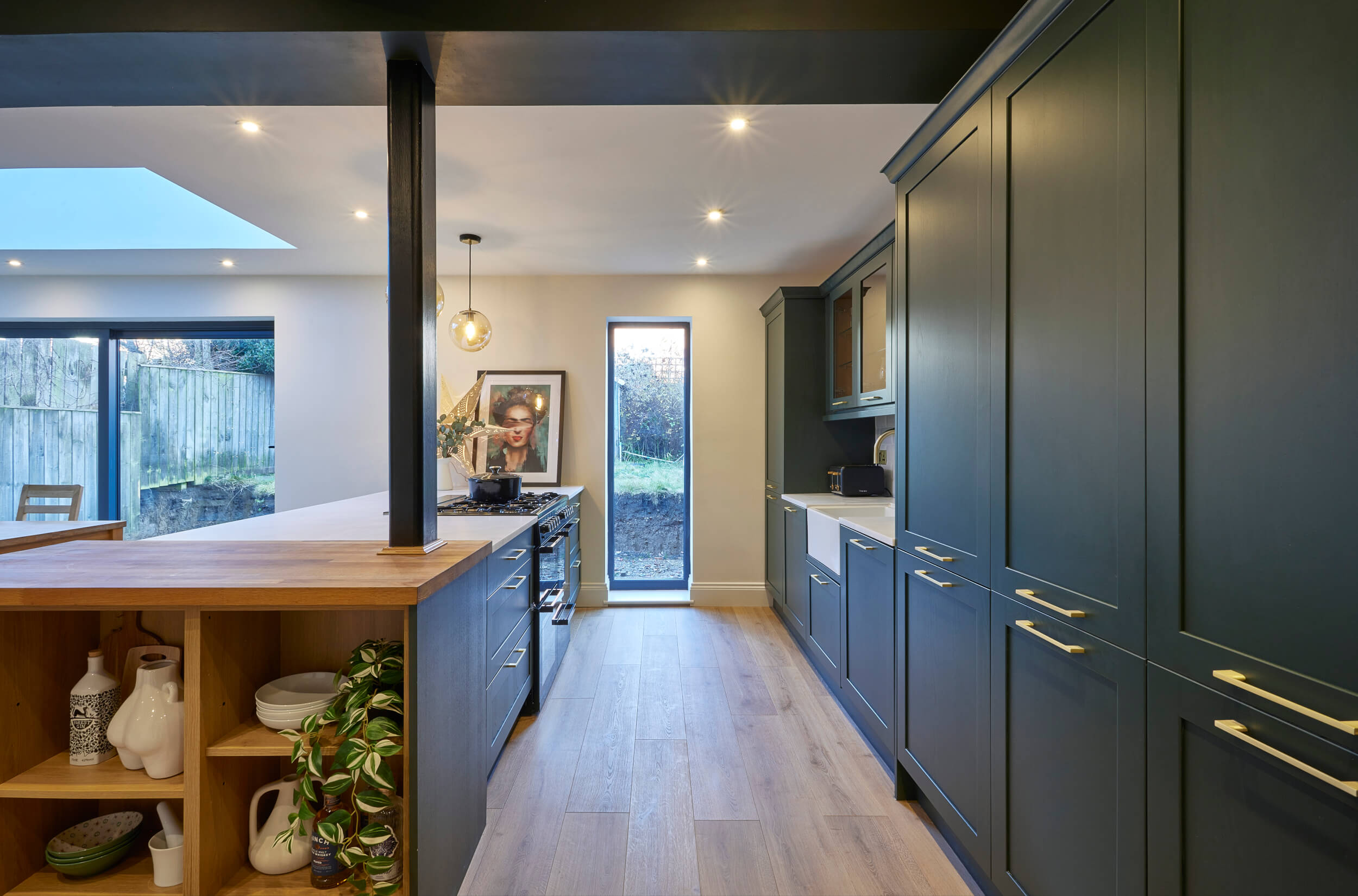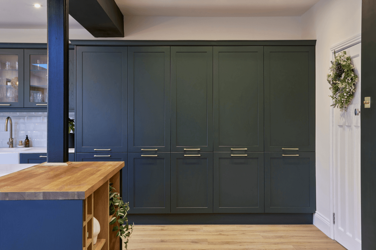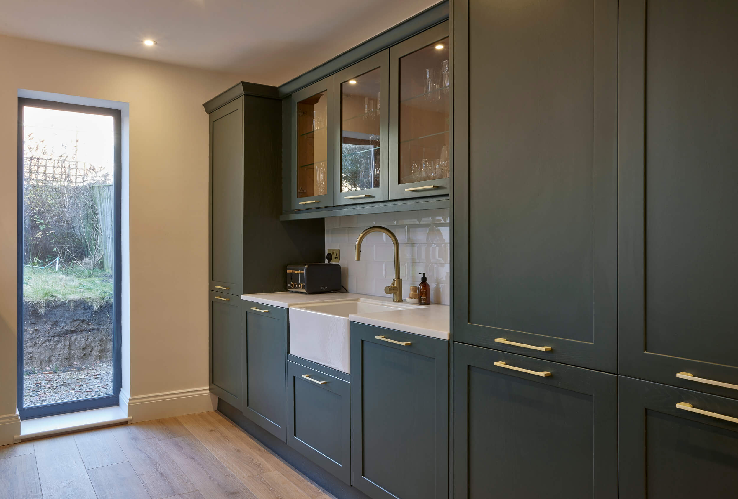 Lynsey was set on a dark green kitchen with tall floor-to-ceiling cabinetry. It was our job to ensure that the kitchen functioned well for family life, cooking and entertaining, while reflecting Lynsey’s timeless taste and tidy style.