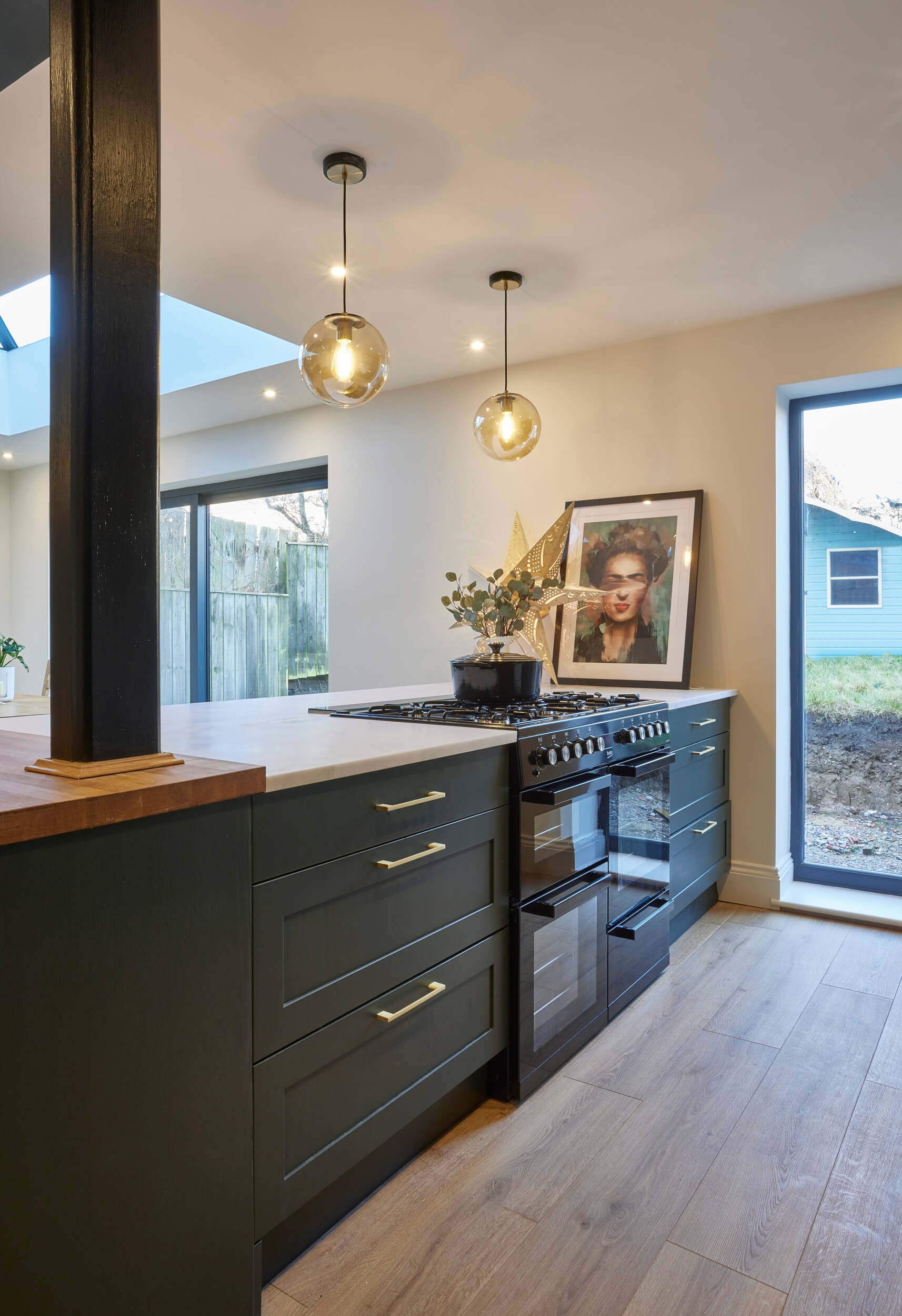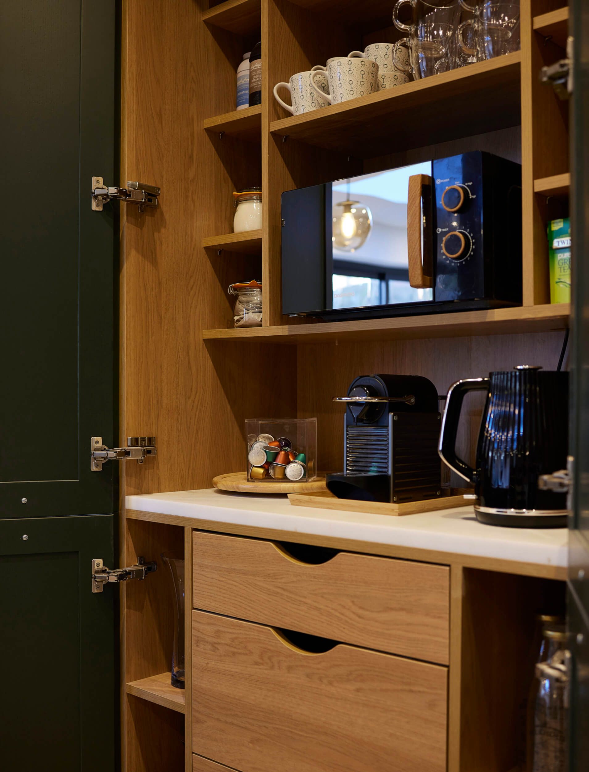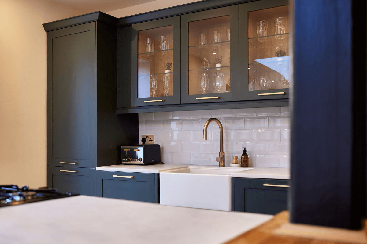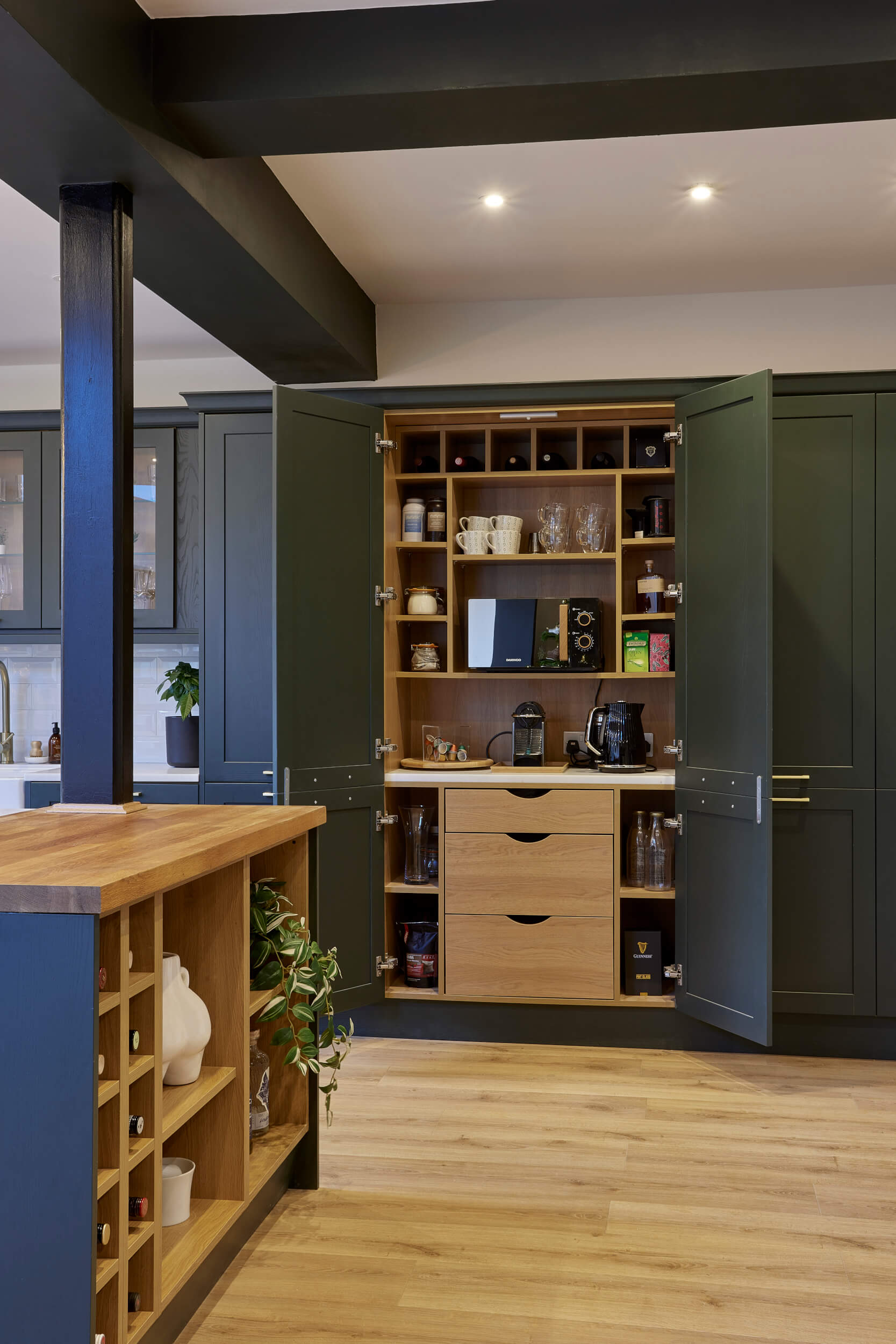 Lynsey was set on a dark green kitchen with tall floor-to-ceiling cabinetry. It was our job to ensure that the kitchen functioned well for family life, cooking and entertaining, while reflecting Lynsey’s timeless taste and tidy style.